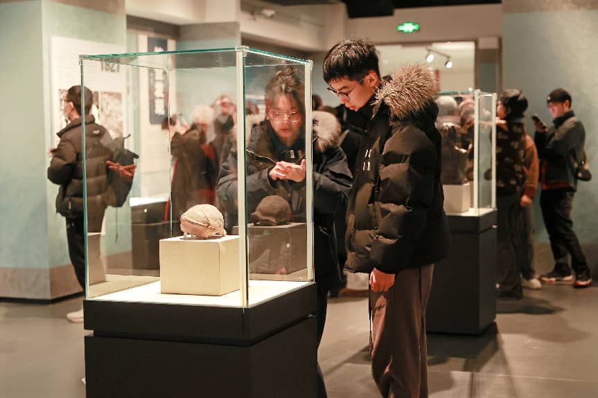 在此次展览中,通过珍贵的化石模型、精美打制石器、用火遗迹以及各类伴生动物化石等多个类别,辅以生动的场景复原,全面展示了从“北京人”到“山顶洞人”的辉煌篇章。漫步展厅中,不仅能看到曾出现在历史教科书上的远古人类复原像,还有展出的遗存以粗犷质朴的造型样式与神秘莫测的远古气息,带领观众穿越时空,深入探寻“北京人”的狩猎采集生活、用火智慧,以及山顶洞人制作装饰品的审美萌芽。